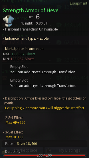 - ส่วนหัวจะเพิ่มป้องกันการการล้มและลอย, ส่วนเกราะจะเพิ่ม Max HP 20 Point กับ Max MP, WP และ SP 20 Point, ส่วนมือจะเพิ่มความแม่นยำ [Accuracy] 8 Point และ ส่วนเท้าจะเพิ่มค่าหลบหลีทุกรูปแบบ [All Evasion]หมายเหตุ: ชุดเกราะ Set นี้สามารถอัพเกรดให้เป็น Steel Taritas Set ได้มาถึงชุดเกราะ Set สุดท้ายที่อาเจ๊นัทจะแนะนำให้เพื่อนๆ ได้รู้จักกันนะคะ ชุดเกราะ Set นี้ถือได้ว่าเป็นชุดที่เพิ่มความสามารถให้ตัวละครในทุกๆ ด้าน แต่อาจจะไม่ได้โดดเด่นเท่าไหร่นัก ถ้ามองถึงประสิทธิภาพต่างๆ แต่อย่างน้อยมันก็เป็นชุดเกราะที่น่าสนใจในช่วงเริ่มเกมเท่านั้นจริงๆ ถ้าให้อัพเกรดไปขั้นสูงๆ ดูยังไงก็ไม่คุ้มทุ่นเท่าไหร่ค่ะสรุปแล้วอาเจ๊นัทเลือกใส่ Set ไหนงั้นหรอ!? อาเจ๊นัทใส่ Grunil Set ส่วนหัวกับมือเพื่อเพิ่มพลังโจมตี แล้วไปใส่เกราะกับเท้าของ Hercules’ Might Set เพิ่มเพิ่มน้ำหนักตัวละครค่ะ เรียกว่า Set นี้ใส่เก็บเลเวลฟาร์มกันยาวๆ ได้เลย!!!สังคมเกมคนไทยเล่น Black Desert ของเซิร์ฟเวอร์ไต้หวัน [TW] คลิ๊กที่นี่