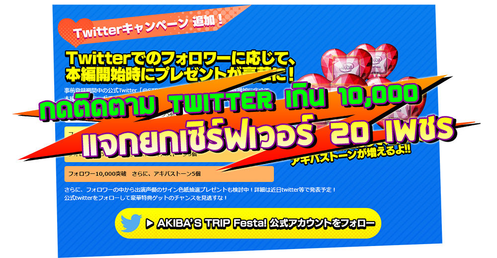 Twitter Campaign : แจกฟรียกเซิร์ฟเวอร์สูงสุดถึง 20เพชร เพียงเข้าไปกดติดตาม Official Twitter ให้ถึง 10,000คน (ต่ำกว่านั้นก็ได้ตามยอด...) ไปยัง Twitter คลิก!