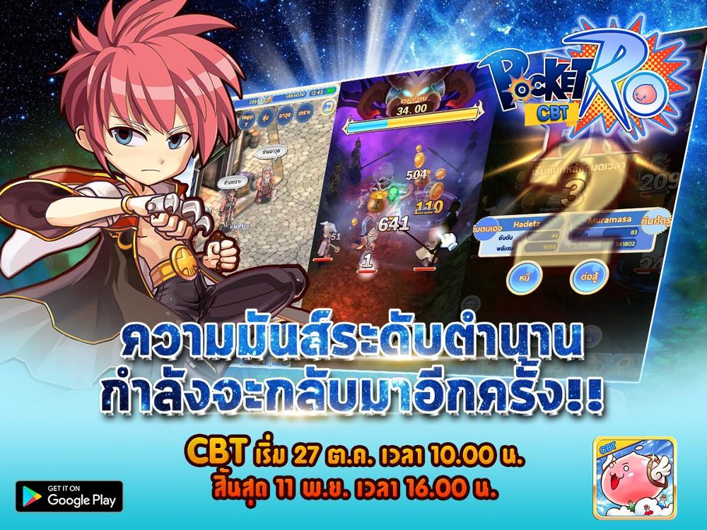 หลังจากได้รับกระแสตอบรับอย่างล้นหลามไปแล้วตอน Alpha Test สาวก RO เตรียมตัวนับถอยหลังกันได้เลย เพราะตอนนี้ Pocket RO ก็มาถึงกำหนดการเปิดให้บริการในช่วง Closed Beta Test (CBT) กันแล้ว โดยคราวนี้ก็เพื่อเตรียมความพร้อมก่อนให้บริการจริงเท่านั้น ยังมิใช่การเปิดให้เล่นตามปกติแต่อย่างใด สำหรับการเปิดให้บริการในช่วง CBT ที่จะถึงนี้นั้น จะเปิดให้ผู้เล่นทุกท่านที่เป็นใช้มือถือในระบบ Android ได้เล่นกันแบบทั่วถึง ลิ้งค์ดาวน์โหลดจะเริ่มปล่อยวันที่ 26 ตุลาคม และไม่ต้องลงทะเบียนแต่อย่างใด และสำหรับระบบ iOS จะยังไม่เปิดให้บริการในช่วงนี้ สำหรับรายละเอียดกำหนดการทดสอบ CBT มีดังนี้
