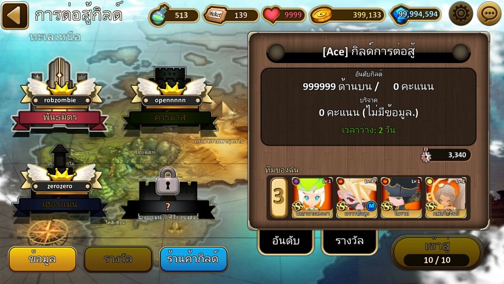 สงครามต่อสู้กิลด์จะเป็น 3 ด่าน ทุกๆกิลด์จะสามารถมาถึงอันดับ TOP ในการต่อสู้กิลด์ก็จะได้รับรางวัล เช่น เหรียญที่จะสามารถใช้เพื่อซื้ออัศวินที่มีเกรดระดับสูงและยังรวมไปถึงกล่องอุปกรณ์สวมใส่.