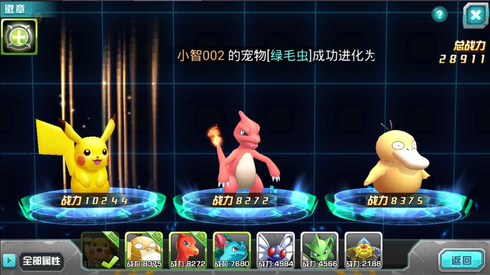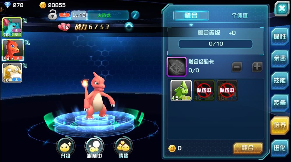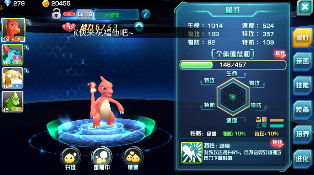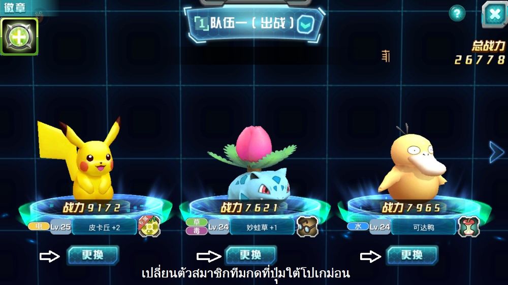 พอกดที่ตัวโปเกม่อน ก็จะเข้าสู่เมนูเรื่องเพิ่มพลังให้โปเกม่อนที่อยู่แถวๆมุมขวาล่าง จะเข้าสู่เมนูจัดการเรื่องเพิ่มพลังโปเกม่อนดังรูป