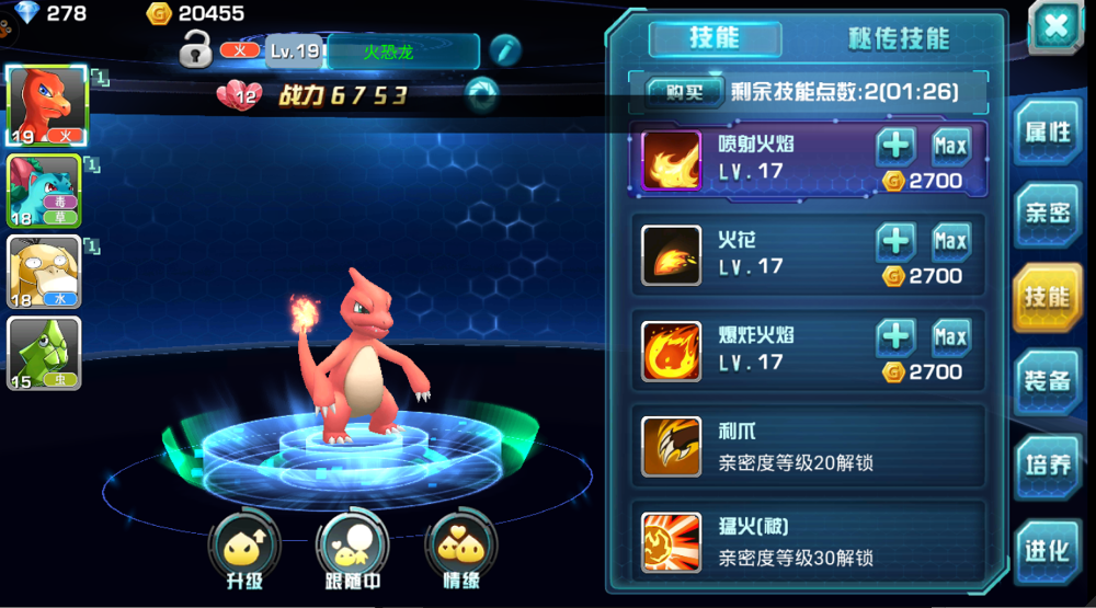 ใช้เงินกดเพิ่มความแรงของสกิล เพิ่มพลังต่อสู้ให้สูงขึ้น ยิ่งระดับสูงยิ่งตบแรงส์ การอัพสกิลแต่ละขั้นต้องการแต้มสกิล 1 แต้ม ซึ่งแต้มสกิลนี้จะได้มาทุกๆ 5 นาที สะสมไปได้เรื่อยๆ (เมื่ออีโวแล้วท่าโจมตีบางท่าจะเปลี่ยนไป แต่ระดับสกิลจะไม่ลดลง)