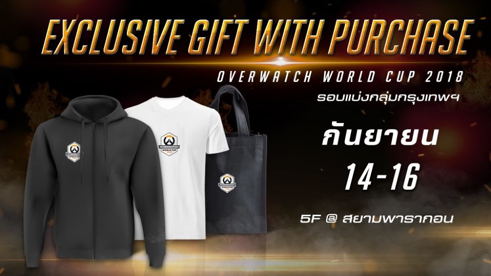 • ซื้อสินค้ารวมมูลค่ามากกว่า 4,500 บาท: รับถุงผ้า Overwatch World Cup 2018 หนึ่งใบ และเสื้อยืด Overwatch World Cup 2018 หนึ่งตัว
