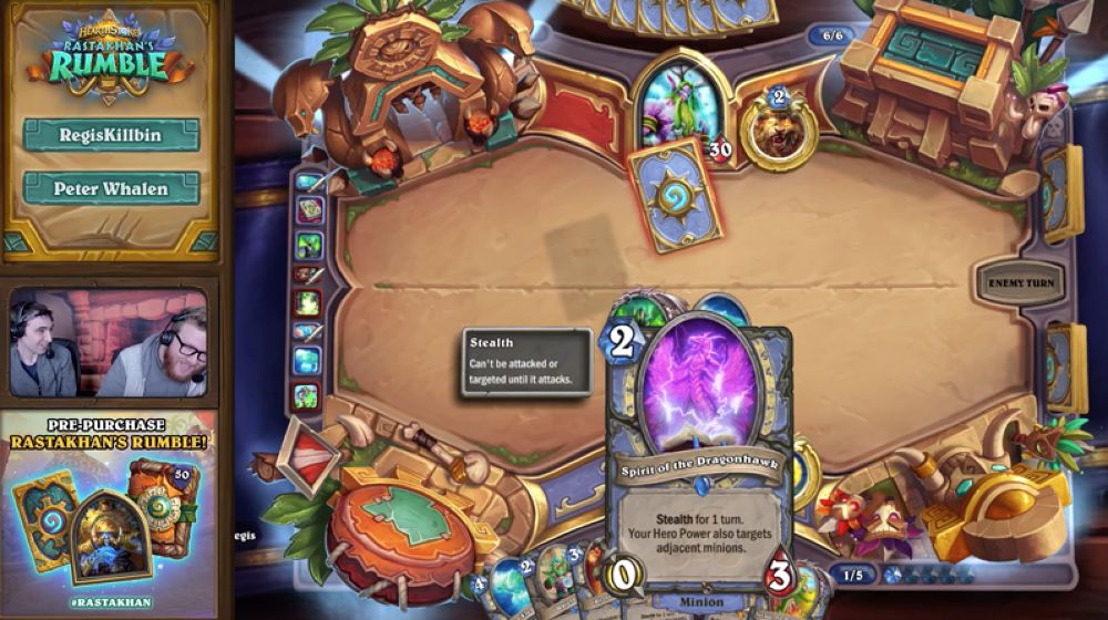 "Spirit of the Dragonhawk" ร่าย 2 ได้ 0-3 ติด Stealth ในเทิร์นแรก พร้อมออล่าทำให้ Hero Power ของเราโจมตีเป้าหมายที่ติดกันด้วย ถือว่าเป็นการ์ดสำคัญที่จะทำให้เราสะสมแต้มดาเมทได้ถึง 8 เร็วๆ ก่อนที่จะถึงเทิร์น 7 ที่ต้องเล่น  Jan’alai, the Dragonhawk อีกทั้งมันยังช่วยเครียดมินเนี่ยตัวเล็กๆ หลายตัวพร้อมกันได้อีกด้วย ถือว่าน่ารําคาญพอสมควรเลยทีเดียว
