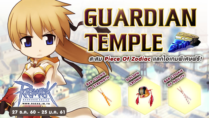 ยังไม่หมดเพียงเท่านั้น Ragnarok Online Thailand ปล่อยกิจกรรมออกมาอย่างต่อเนื่องเพื่อคืนความสุขกับคอเกมทั้งหลาย ล่าสุดกับกิจกรรม Guardian Temple ให้ทุกคนสะสม Piece Of Zodiac เพื่อนำมาแลกรับไอเท็มฟรีมากมายตั้งแต่วันนี้ถึง 25 มกราคม 2561