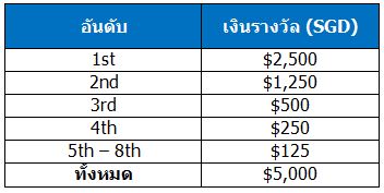 - เงินรางวัล: เงินรางวัลในการแข่งขันทั้งสิ้น $5,000 สิงคโปร์ดอลล่าห์ ซึ่งจำแนกเป็นอันดับดังต่อไปนี้