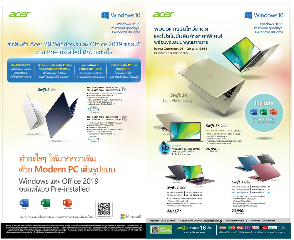สำหรับผู้ที่กำลังมองหา Modern PC หรือโน้ตบุคสำหรับทำงาน Swift 3 และ Swift 5 ก็จัดโปรโมชั่นพิเศษ ซื้อ Swift 3 หรือ Swift 5 รุ่นที่ร่วมรายการ จะได้รับ Windows และ Officie 2019 ของแท้ ซึ่งติดตั้งให้กับเครื่องไปเลยฟรีๆ อีกด้วย นอกจากนี้ยังมีสินค้าอื่นๆ ที่ร่วมรายการอย่าง Nitro 5 ที่มีการรับประกัน 3 ปีฟรี พร้อมของพรีเมี่ยมสุดพิเศษ มากมายรวมไปถึงสินค้าอื่นๆ อย่าง Acer Monitor, Acer Projector ทุกรุ่นที่ร่วมรายการ ซึ่งงาน COMMART XTREME 2020 จัดขึ้นที่ ไบเทคบางนา
