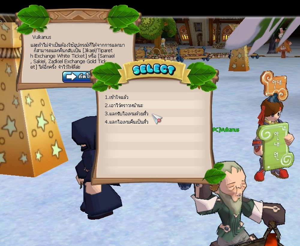 2. ให้คุยกับเขาและเลือกหัวข้อที่ 1 ต่อด้วยหัวข้อที่ 1 แล้วเลือกหัวข้อ “แลกรับไอเทมด้วยตั๋ว”