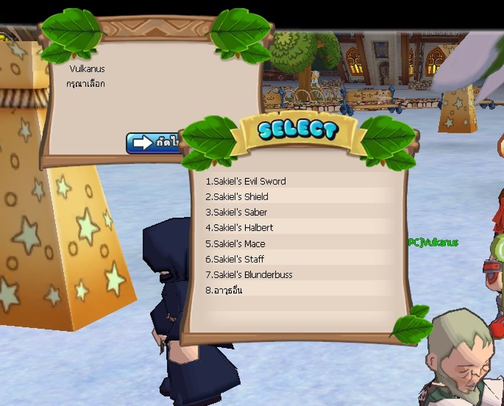 4. เมื่อเลือกแล้ว จะมีรายชื่อของอาวุธแต่ละอาชีพขึ้นมาให้ผู้เล่นเลือก ถ้าผู้เล่นเกิดไม่มั่นใจขึ้นมาว่าอาวุธชิ้นที่เลือกเป็นของอาชีพไหน ให้กดเลือกที่ชื่อของอาวุธชิ้นนั้น NPC จะอธิบายว่าอาวุธชิ้นนี้มีไว้สำหรับอาชีพใด