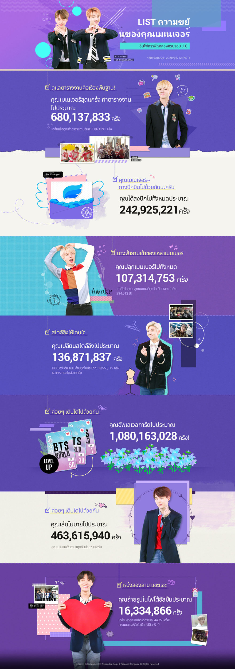 หลังจากที่เปิดให้บริการมาเป็นเวลาครบ 1 ปี สำหรับ BTS World เกมที่ให้คุณได้สัมผัสและสนุกกับเหล่าสมาชิกวง KPOP ระดับโลกอย่าง BTS นับตั้งแต่เปิดให้บริการในเดือนมิถุนายนในปี 2019 ทาง Netmarble ได้อัปเดตเพื่อเฉลิมฉลองครบรอบ 1 ปี กับอีเว้นท์พิเศษ "ความทรงจำอันล้ำค่าของพวกเรา"  โดยสามารถทำภารกิจทั้งหมดสำเร็จ จะได้รับใบเลือกการ์ด 5 ดาว ไปเลย รวมไปถึงกิจกรรมสุ่มโดยแยกเป็นยูนิทของแทร็คจาก OST ของ BTS WORLD