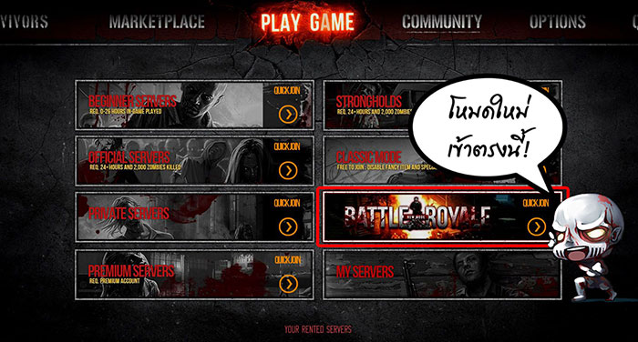 ช่วง Pre-Beta Test (ทดสอบระบบ)• เริ่มทดสอบ : วันที่ 29 สิงหาคม 2560 (หลังปิดปรับปรุงเซิร์ฟเวอร์ประจำสัปดาห์)• สิ้นสุดการทดสอบ (Reset แต้ม) : วันที่ 5 กันยายน 2560 (ก่อนปิดปรับปรุงเซิร์ฟเวอร์ประจำสัปดาห์)ช่วง Preseason (สะสมแต้มคะแนน รับยศใหม่)• เริ่มทดสอบ : วันที่ 5 กันยายน 2560 (หลังปิดปรับปรุงเซิร์ฟเวอร์ประจำสัปดาห์)สิ้นสุดการทดสอบ (Reset แต้ม) : วันที่ 3 ตุลาคม 2560 (ก่อนปิดปรับปรุงเซิร์ฟเวอร์ประจำสัปดาห์)ช่วง Open (เปิดโหมดอย่างเต็มรูปแบบ Season 1)• เปิดโหมดเต็มรูปแบบ : วันที่ 3 ตุลาคม 2560 เป็นต้นไป (หลังปิดปรับปรุงเซิร์ฟเวอร์ประจำสัปดาห์)• มาพร้อมระบบแลกของสุดพรีเมี่ยม! ทั้งโทรศัพท์มือถือ รถจักรยานยนต์ บัตรเงินสด เกมมิ่งเกียร์ ยศใหม่ๆ และอื่นๆอีกมากมาย! โดยใช้ BR Point & BR Coin, ระบบกาชาปองสุ่มลุ้นโชค พร้อมระเบิดศึกการแข่งขัน "King of the Survivor" ชิงเงินรางวัลรวมมูลค่ากว่า 5 หมื่นบาท !! สู่สมรภูมิเดือดกลางงาน TGSBIG 2017 (รอติดตามรายละเอียด)• สามารถเข้าเล่นได้โดยการคลิกที่ ปุ่ม >> Battle Royale << ตรงหน้าเลือก Channel ตามรูปภาพด้านล่างนี้จะเป็นการ Quick Join เข้าเล่นโหมดโดยอัตโนมัติ• ผู้เล่นจะเข้าสู่ห้อง "Waiting Room" บนบอลลูนยักษ์เหนือเกาะ Lost lsland ซึ่งจะจุได้สูงสุด 100 คน และถ้าผู้เล่นเข้ามาจนถึง 70/100 คน ระบบจะเริ่มนับถอยหลัง 90 วินาที เพื่อเริ่มปล่อยผู้รอดชีวิตทุกคน ดิ่งลงสู่เกาะ Lost lsland