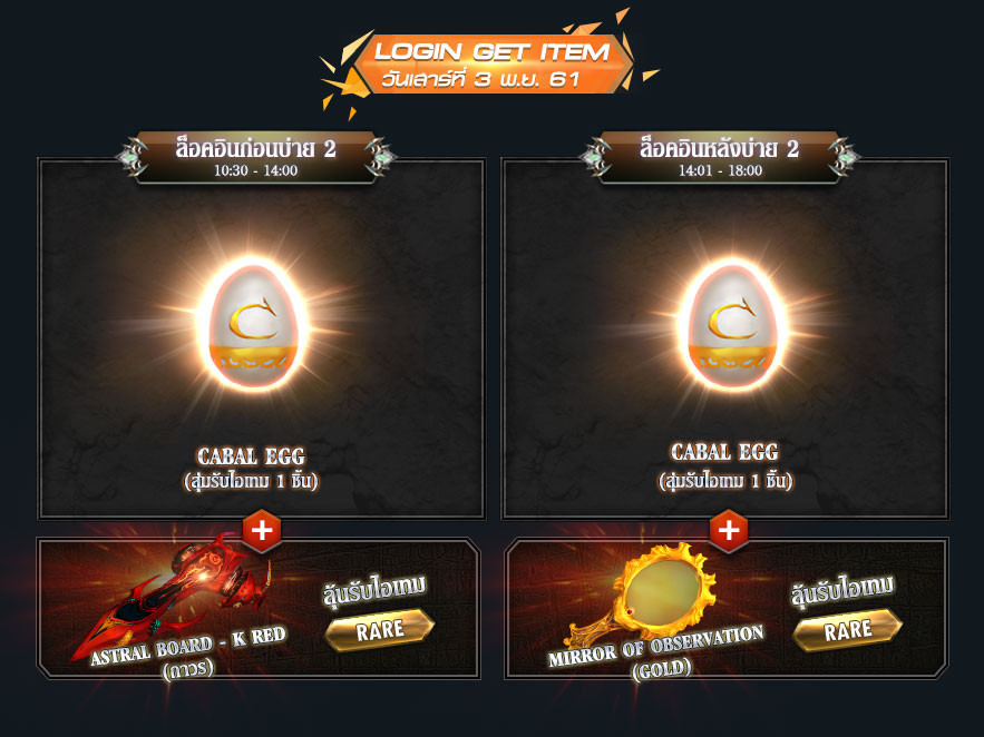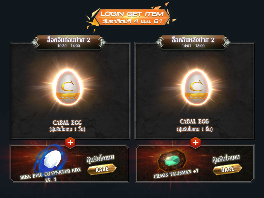 งานที่เกมเมอร์ตัวจริงต้องมา! เตรียมพบกับกิจกรรมสนุกๆและของรางวัลมากมายภายในงาน พิเศษ! เพียงลงทะเบียนเข้างานก็รับไอเทมไปเลยฟรีๆ!! โดยไอเทมจะแบ่งเป็นรอบเช้าและรอบเย็น ล็อคอินทั้ง 2 รอบก็รับไอเทมฟรีไปเลย 2 รอบ ยังไม่หมดเท่านั้น! ผู้เล่นที่ล็อคอินไม่ว่าจะรอบเช้าหรือรอบเย็น รอบไหนก็ได้ลุ้นรับไอเทมแรร์ที่จะสุ่มแจกให้ผู้โชคดีเพิ่มไปอีกกกก จัดหนักแจกเต็มกันขนาดนี้ รับประกันได้เลยว่าไม่มีใครกลับบ้านมือเปล่าแน่นอน!