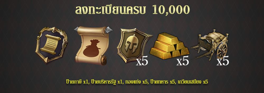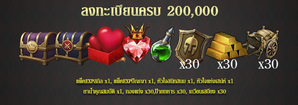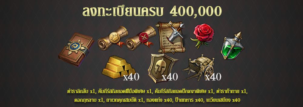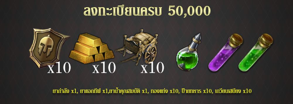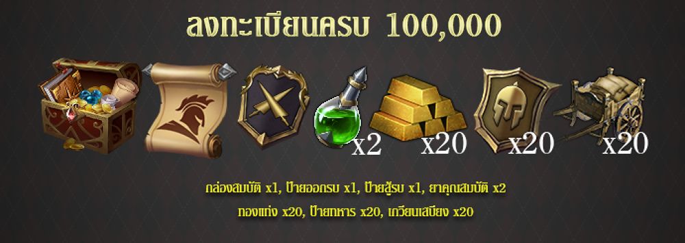 สำหรับผู้ที่ลงทะเบียนล่วงหน้า จะได้รับไอเทมทันที 8 ชนิด นอกจากนั้นยังสามารถชวนเพื่อนมาเป็นผู้บุกเบิกอีก 5 ท่านก็จะได้รับไอเทมอีก 5 ชนิดด้วยกัน รวมไปถึงหากมียอดจำนวนผู้ลงทะเบียนครบตามที่กำหนด ซึ่งจะมีตั้งแต่ 10,000 ไอดี, 50,000 ไอดี,100,000 ไอดี, 200,000 ไอดี, และ 400,000 ไอดี ก็จะได้รับไอเทมเพิ่มฟรีอีกยกเซิร์ฟเวอร์ด้วย