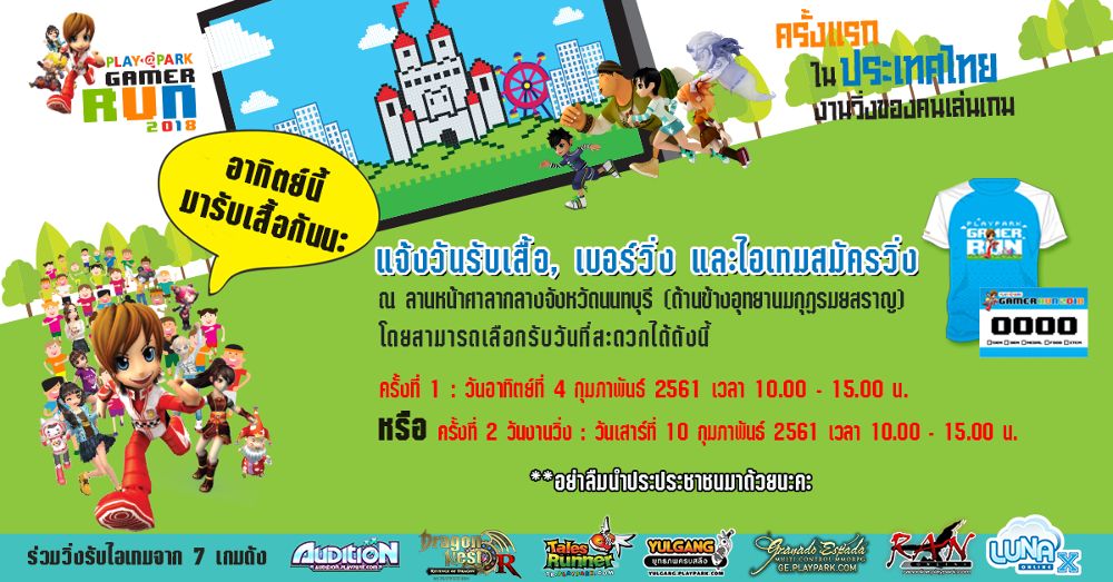 สำหรับเกมเมอร์คนไหนที่ลงทะเบียนร่วมเป็นส่วนหนึ่งของแคมเปญครั้งยิ่งใหญ่นี้ อย่าลืม!!! เจอกันวันที่ 10 กุมภาพันธ์ 2561 ณ อุทยานมกุฏรมยสราญ ศาลากลางจังหวัดนนทบุรี โดยสามารถลงทะเบียนรับเสื้อและไอเทมได้ตั้งแต่เวลา 15.00 น. และเริ่มวิ่งเวลา 17.00 น. ส่วนใครที่ลงทะเบียนสมัครไม่ทันไม่ต้องเสียใจ ติดตามภาพบรรยากาศและข่าวสารอัพเดทได้ที่ Facebook PLAYPARK https://www.facebook.com/PlayparkLive รับประกันความสนุกสุดฮา มาร่วมให้กำลังใจเหล่าเกมเมอร์นักวิ่งกันเถอะ! รายละเอียดแคมเปญเพิ่มเติม http://bit.ly/PPGamerRun