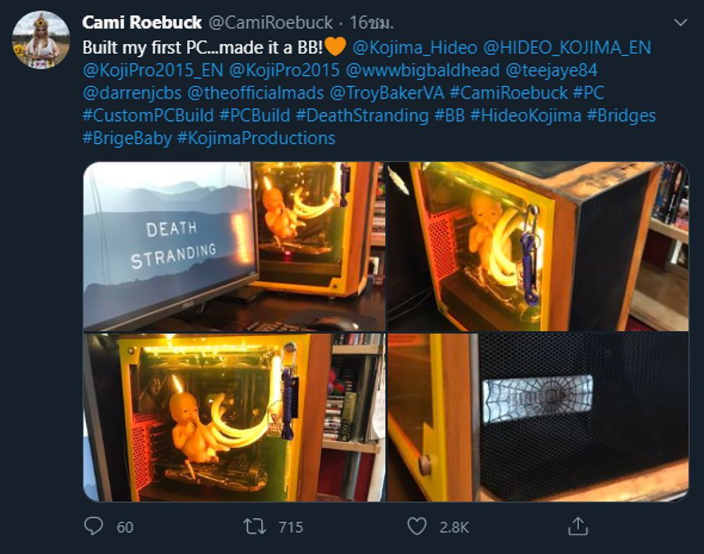 เรียกได้ว่าใครที่เป็นแฟนเกม Death Stranding แล้วได้ชมภาพเหล่านี้ ก็น่าจะอยากประกอบคอมโดยมีน้อง BB (Bridge baby) อยู่ภายในเครื่อง PC ของตัวเองกันบ้างแน่นอน! เมื่อผู้ใช้งานนาม Cami Roebuck บนโซเชี่ยล Twitter ได้เผยอัลบั้มภาพ และคลิปวิดีโอของเครื่องคอมพิวเตอร์ PC ที่ประกอบ และออกแบบขึ้นมาเองโดยมีแรงบันดาลใจมาจากเกม Death Stranding ได้สุดน่ารักมากๆ สามารถรับชมภาพ และคลิปทั้งหมดได้ที่ลิงค์นี้ คลิปตัวอย่างเกม Death Stranding สำหรับภาพดังกล่าว ก็ถือเป็นการบ่งบอกเลยว่าคุณ Cami Roebuckได้ออกแบบ PC นี้ขึ้นมาให้เหมือนกับ Portable Pod ที่ตัวเอกอย่าง Sam Bridge พกติดตัวเอาไว้ให้ BB ของเราสามารถผจญภัยไปด้วยกันได้นั่นเอง แต่ก็ไม่คาดฝันเลยว่ามันจะสามารถนำไอเดียนี้มาดัดแปลงให้เป็นเครื่อง PC ได้สวยงามด้วย แถมคุณ Cami Roebuck ก็ได้ยืนยันว่าตัว BB จะไม่ถูกละลายเพราะความร้อนคอมพิวเตอร์แน่นอน เนื่องจากเธอได้วางแผนเตรียมรับมือเอาไว้แล้วตามคลิป รวมทั้งใครหลายคนที่เห็นแล้วก็น่าจะอยาก หรือกลับไปเล่นเกมอย่าง Death Stranding กันเลยแน่ๆ ส่วน Death Stranding ก็จะเป็นเกมแนว Action Adventure Open World ชื่อดังจากค่าย Kojima Production ที่จะให้ผู้เล่นได้สวมบทเป็นนักส่งของไปรษณีย์สุดสำคัญ ภายในโลกล่มสลายจนทำให้มนุษย์ไม่สามารถใช้ชีวิตได้อย่างปกติ แถมผู้เล่นก็ยังสามารถออนไลน์มาช่วยกันสร้างอะไรต่างๆ บนโลก เพื่อให้ผจญภัยสะดวกสบายร่วมกันได้ด้วย (แต่จะไม่สามารถเจอกันได้) ซึ่งเกมได้วางจำหน่ายแล้วทั้งบนแพลตฟอร์ม PC และ PlayStation 4 สามารถเข้าไปซื้อเล่นบน Steam ได้ที่ลิงค์ด้านล่างนี้เลย ที่มาข่าว & ที่มาภาพ: Steam, Twitter