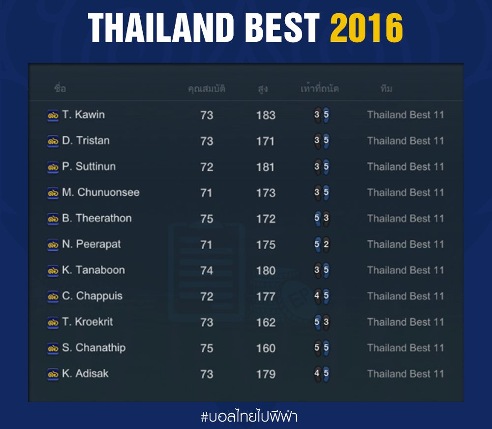 โดยรายชื่อนักเตะทั้ง 11 คน หรือทีม “Thailand Best 2016” มีรายชื่อดังต่อไปนี้