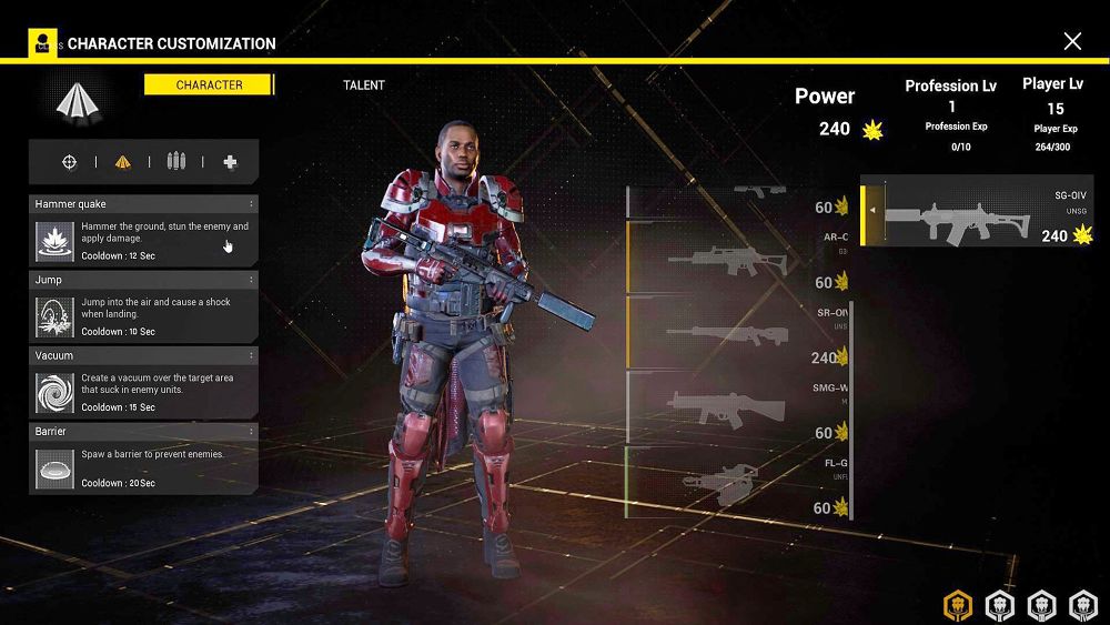 - ตัวเกมจะมีระบบเลเวลของอาชีพนั้นๆ ให้เก็บจนถึง 30 โดยช่วงเลเวล 3, 5, 8, 10, 15, 20, 25, 30 ผู้เล่นจะได้รับสกิลติดตัวให้เลือกความสามารถแตกต่างกันได้สกิลละ 3 แบบ (ยกตัวอย่างพอผู้เล่นเลเวล 25 ก็จะมีการปลดล็อก 1 สกิลติดตัวใหม่ให้เลือกได้ว่าจะเอารูปแบบเพิ่มความถึก, แบกกระสุนได้เยอะขึ้น หรือโจมตีแรงขึ้น)