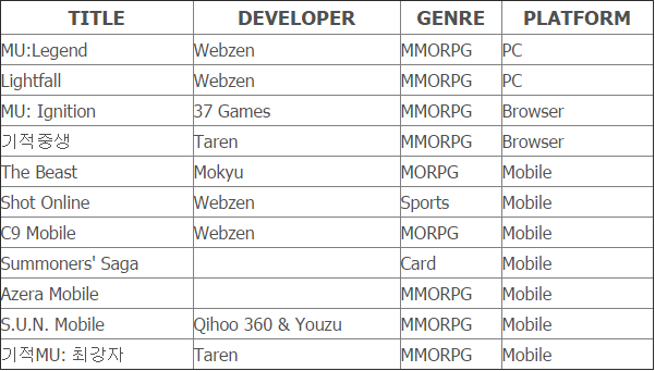 Webzen ประกาศเปิดตัวเกมส์ดัง กว่า11เกมส์ ทั้งเกมประเภท MMO และ Mobile Games ซึ่งในจำนวนหนังมีเกมส์ดังระดับ BlockBuster อย่าง Lightfall , MU:Legend และ C9 Mobile รวมอยู่ในนั้น โดยสามารถดูรายละเอียดเกมส์ชื่อดังที่เปิดตัวได้ที่ตารางข้างล่างนี้