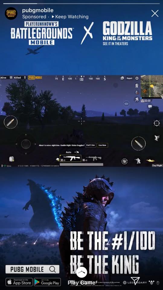 การโคลาโบร่วมมือกันระหว่าง PUBG Mobile และราชันย์แห่งอสูรกายทั้งมวลอย่าง Godzilla ที่กำลังจะมีหนังภาค 2 เข้าฉายในสิ้นเดือนนี้โดยการร่วมมือครั้งนี้น่าจะคล้ายๆกับ Resident Evil นั่นคืออาจจะมีโหมดพิเศษ ชุด เครื่องแต่งกาย และสกินที่จะหาได้จากอีเวนท์นี้เท่านั้น โดยตอนนี้นอกจากภาพที่ปล่อยมา กับคลิปวิดีโอทีเซอร์นิดๆหน่อยๆที่โผล่มาเป็นโฆษณาบน Instagram เผยให้เห็นว่าเจ้าก๊อดซิลล่าอาจจะมาบุก Erangel ก็เป็นได้ มารอดูแพทช์อัพเดทชุดนี้กันครับ ว่าจะเป็นยังไงกันบ้างสำหรับการร่วมมือกันครั้งนี้