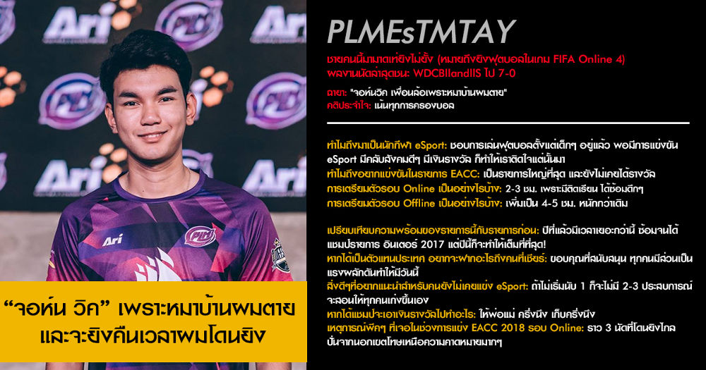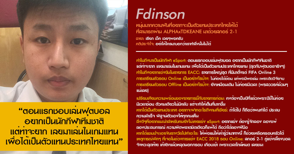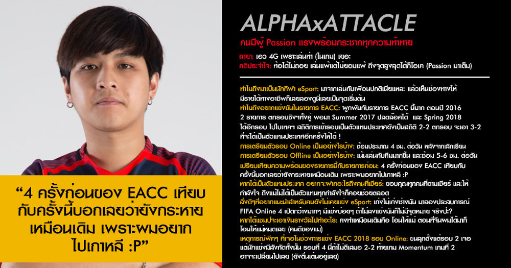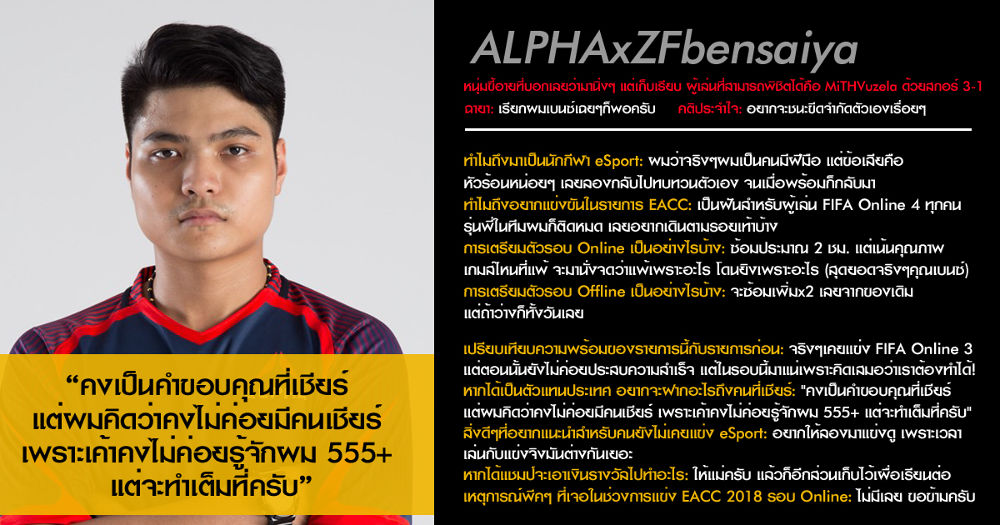 โดยวันนี้ทางทีมงาน FIFA Online 4 ทำสกรู๊ปน่าสนใจเกี่ยวกับนักแข่งที่เป็น "ตัวเต็ง" จากฟอร์มการแข่งขันรอบที่ผ่านมา และ "ผู้เล่นน่าจับตามอง" ที่พร้อมจะมาสร้างปรากฎการณ์หน้าใหม่ให้ประจักษ์ใน FIFA Online 4 หากพร้อมแล้วเรามาลองติดตามบทสัมภาษณ์ของนักแข่งเหล่านี้กัน