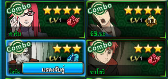 [ตอนจัดทีม อย่ายืมกดแสดงจับคู่ดู ว่านินจาคนไหนต่อคอมโบกับใครได้บ้าง ซึ่งการต่อคอมโบให้ดูเอฟเฟคท่า ว่าเป็นท่าซัดลอยตัวต่ำ ลอยตัวสูง กระเด็น หรือล้ม]