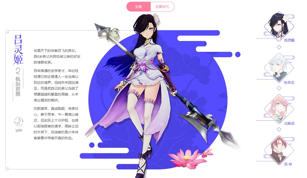 - ตัวละครเอกเป็นหญิงสาวในชื่อ Lu Lingji ที่มีความสามารถด้านศิลปะต่อสู้ และผู้เล่นก็จะได้พบเจอกับผู้ร่วมผจญภัยเพิ่มอีก 3 คน