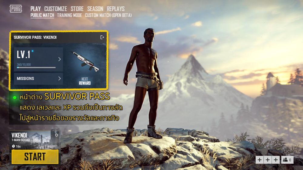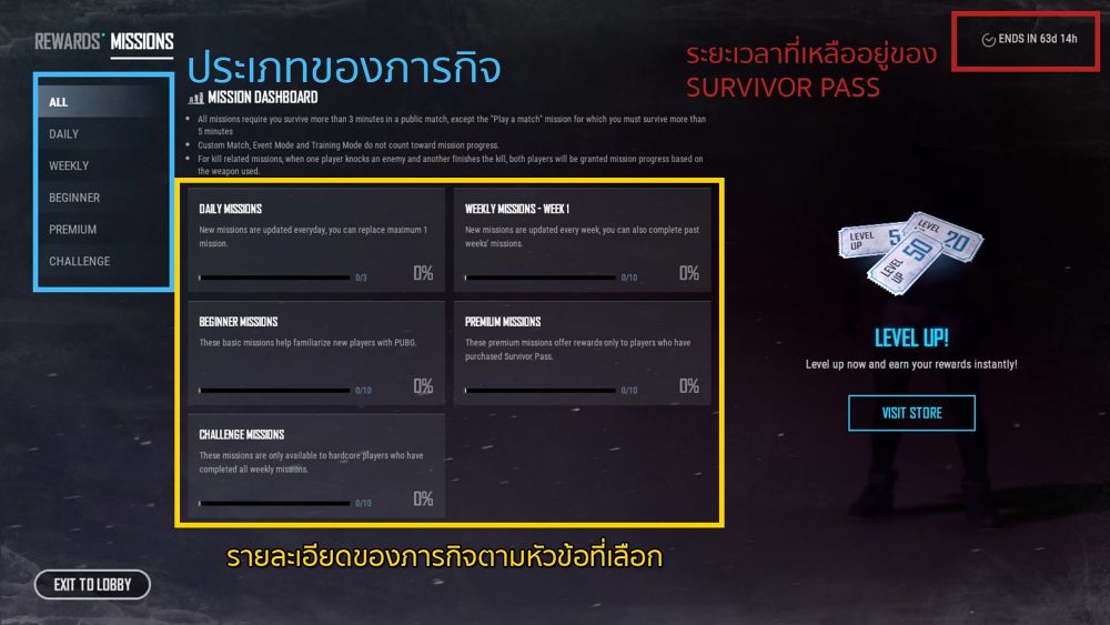 นอกจากนี้ยังสามารถกดที่เลเวลของคุณเพื่อไปดูรายละเอียดของรางวัลต่างๆ หรือกดที่ปุ่มภารกิจเพื่อไปสู่หน้ารายชื่อภารกิจได้ หรือจะกดที่ปุ่มด้านขวาบนของหน้าจอเพื่อไปเยี่ยมชมเว็บไซต์ของ Survivor Pass Vikendi ก็ได้ด้วย!