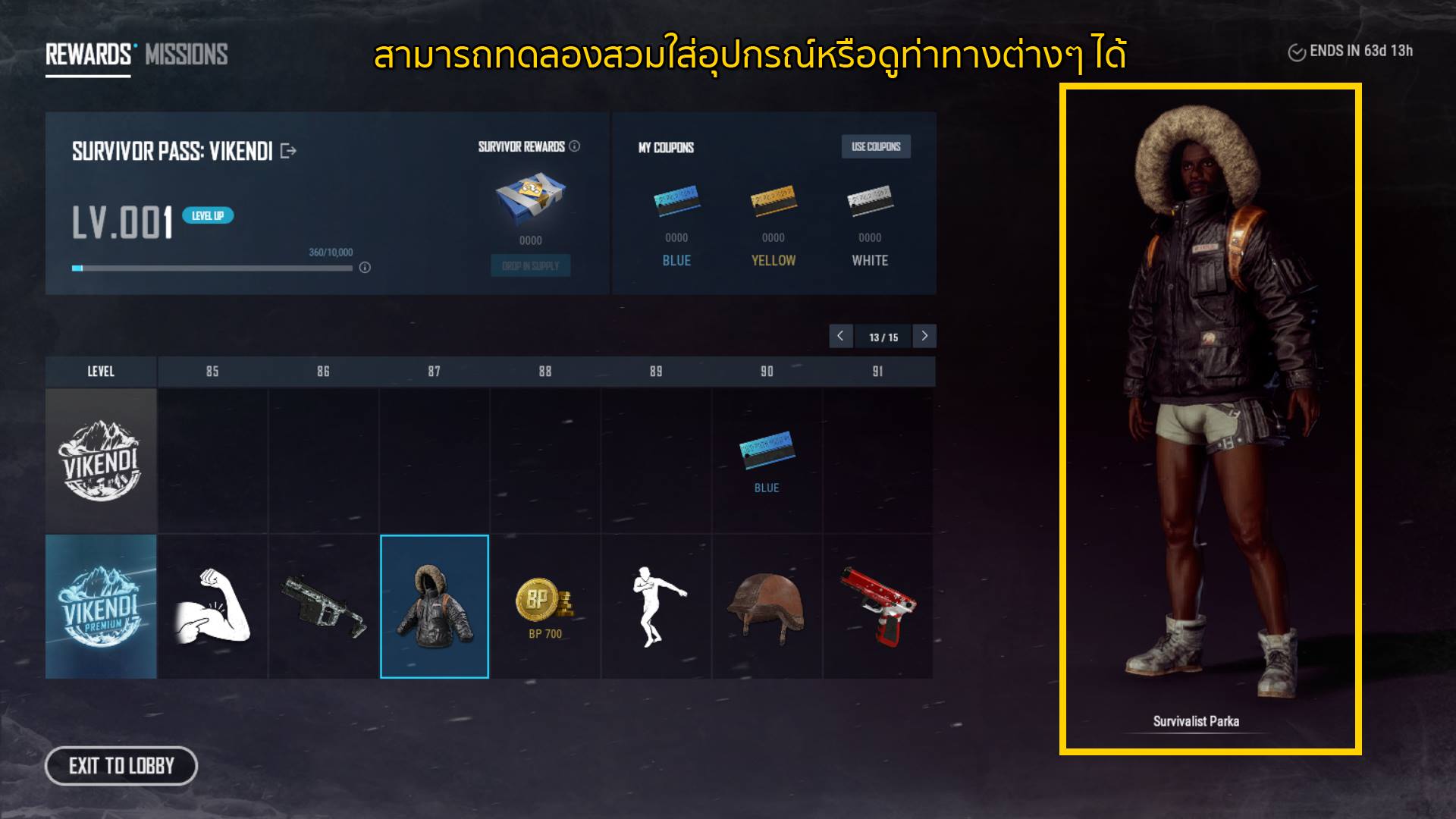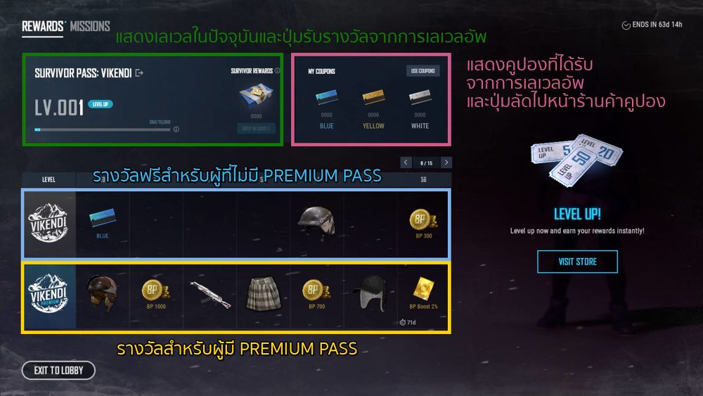 ที่ด้านบนคุณจะเห็นถึงระดับเลเวลของคุณรวมถึงปุ่มสำหรับรับ Survivor rewards ที่จะได้รับ 1 กล่องทุกๆครั้งที่คุณเลเวลอัพ โดยเมื่อคุณเปิดกล่องนี้คุณจะสุ่มได้รับคูปอง น้ำเงิน เหลือ หรือ ขาว ที่สามารถนำไปแลกของรางวัลได้ที่ร้านค้าคูปองที่จะเปิดให้บริการในช่วงเวลาที่ Survivor pass ยังคงเปิดอยู่ด้วย