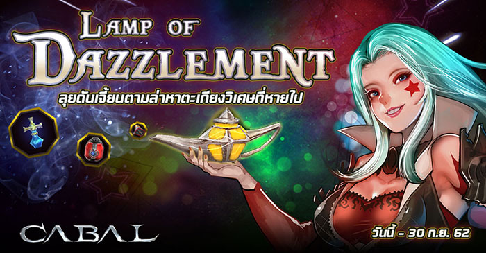 ภารกิจสุดพิเศษกับการช่วยเหลือ NPC Yul ที่กำลังตามหาตะเกียงวิเศษ Lamp of Dazzlement ที่หายไปอย่างลึกลับในดันเจี้ยน Chaos Arena พร้อมลุ้นรับไอเทมมากมายเป็นการตอบแทน ออกตามหาได้ตั้งแต่วันนี้ - 30 กันยายน 2562 "ลองถูตะเกียงดูสิ ข้างในอาจจะมีอะไรก็อยู่ก็เป็นได้!" ตั้งแต่วันนี้ถึง 30 กันยายน 2562 สามารถติดตามรายละเอียดเพิ่มเติมได้ที่ >> https://cabal.exe.in.th/news/lamp-of-dazzlement