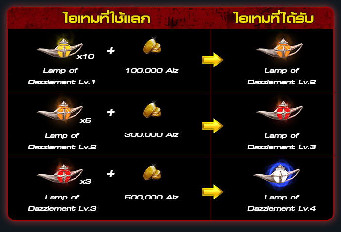 •เมื่อถึงระยะเวลากิจกรรมผู้เล่นสามารถสะสมไอเทม Lamp of Dazzlement Lv.1 จากดันเจี้ยนที่กำหนด •สามารถนำไอเทม Lamp of Dazzlement Lv.1 มาแลกได้ที่ NPC Yul สาวสวยที่เมือง Bloody Ice พร้อมเงิน Alz เพื่อเพิ่มระดับไอเทมได้ตามรายการด้านล่างนี้