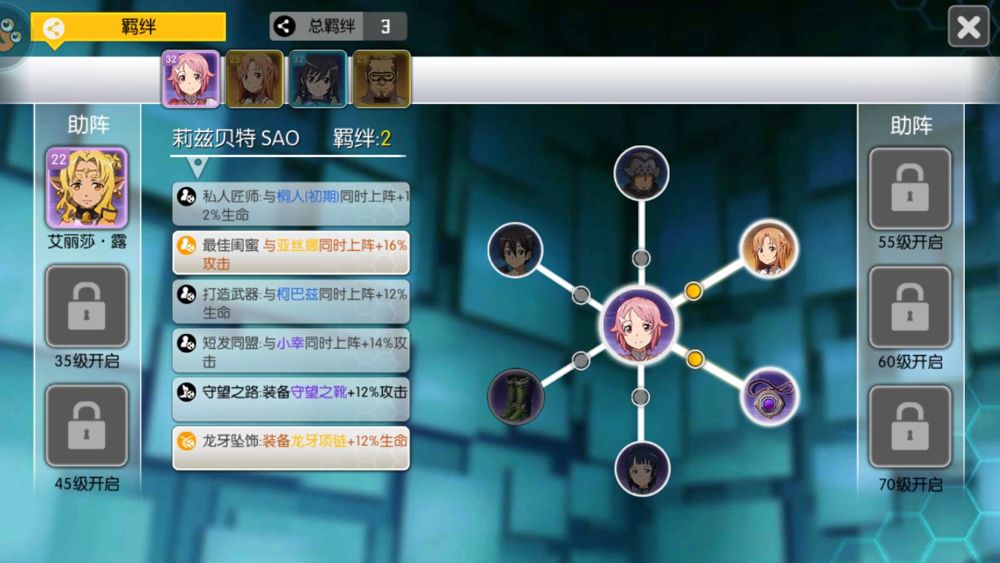เป็นเงื่อนไขที่จะเพิ่มความสามารถของตัวละครได้ จากตัวอย่างคือ เมื่อมีตัวละครในทีม หรือใส่ของสวมใส่ตามที่ระบุ จะได้รับความสามารถเพิ่มสูงขึ้น ตัวอย่างจากรูปคือ เมื่อลิซเบธ ร่วมทีมกับ อาสึนะชุดกางเขนเลือด จะได้รับพลังโจมตี +16% / ใส่สร้อยคอเขี้ยวมังกร Max HP+12% เป็นต้น, นอกจากนี้เรายังติดตัวละครสำรองเป็นตัวช่วยเพิ่มสถานะได้ 6 ตัวด้วยกัน โดยจะติดเพิ่่มได้ 1 ตัวเมื่อเลเวล 25 และมากขึ้นเรื่อยๆตามเลเวลที่สูงขึ้น 35 45 55 60 70