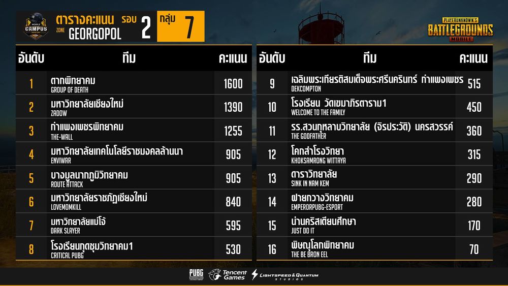 การแข่งขัน PUBG Mobile Campus Survival Series นับเป็นการแข่งขันอย่างเป็นทางการครั้งแรกของเกม PUBG Mobile โดยเป็นการแข่งขันระดับนักเรียน นักศึกษา ทั่วประเทศ ซึ่งจะถูกแบ่งออกเป็น 4 โซนได้แก่ Georgopol (ภาคเหนือ) Pochinki (ภาคกลาง) Rozhok (ภาคอีสาน) Gatka (ภาคใต้) และจากทีมที่เข้าร่วมสมัครกว่า 1,280 ทีม