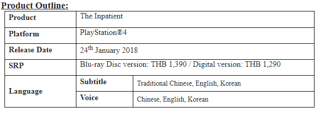 Sony Interactive Entertainment สาขาสิงคโปร์ (SIES) ประกาศเลื่อนวันวางจำหน่ายเกม “The Inpatient” จากเดิมวันที่ 22 พฤศจิกายนนี้ เป็นวันที่ 24 มกราคม 2561 เพื่อให้ทีมนักพัฒนามีเวลาเก็บรายละเอียดต่างๆ ในเกมเพื่อมอบความสุขและสนุกสนานให้ผู้เล่นมากที่สุดนั่นเองจ้า ว่าแล้วระหว่างรอเราไปดูตัวอย่างเกมมันส์ๆ เพื่อบิ้วต่อมความอยากกันดีกว่า!