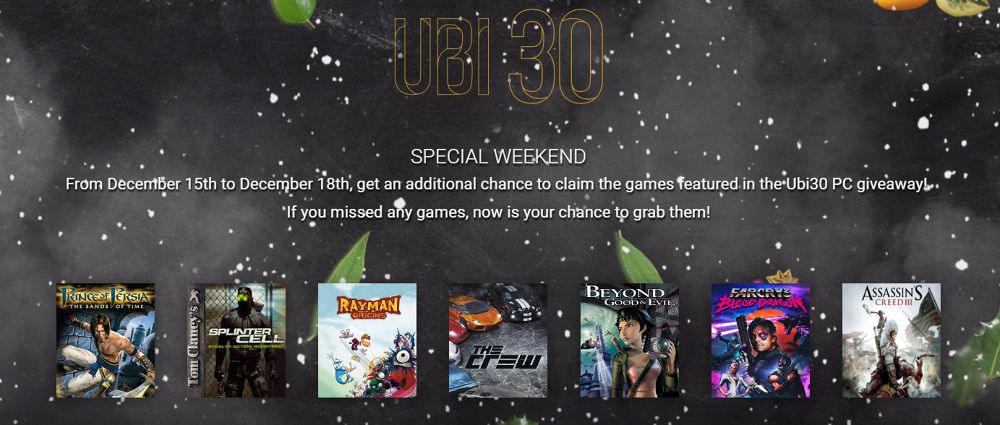 ผ่านมาแป๊บเดียวค่ายเกมยักษ์ใหญ่อย่าง Ubisoft ก็อยู่คู่วงการเกม และสร้างเกมมาให้พวกเราได้เล่นกันมาถึง 30 ปีแล้ว นับว่าเป็นเวลาที่นานมากเลยทีเดียวล่ะครับ ซึ่งในโอกาสนี้เอง ทางค่ายเกมก็เลยทำการแจกเกมให้เราเข้าไปกดรับกันได้ฟรีๆ เดือนละ 1 เกม ตั้งแต่เมื่อหลายเดือนก่อน จนปัจจุบันรวมแล้วมีถึง 7 เกมด้วยกัน แต่ว่าสำหรับคนที่พลาดกดเกมฟรีในแต่ละเดือนไป อย่าเพิ่งน้อยใจไป เพราะว่าใน วันที่ 15 - 18 ธันวาคม 2016 นี้ทางค่ายได้ทำการแจกรวดเดียว 7 เกมกันไปเลย ซึ่งรายชื่อเกมทั้งหมดมีดังนี้ครับ