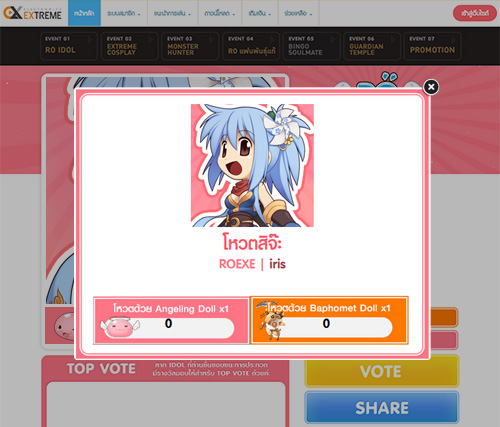 1.ผู้เล่นเกม Ragnarok จะได้รับสิทธิ์โหวตคะแนนฟรี วันละ 1 สิทธิ์ / ไอดี ( หน่วย Baphomet Doll)