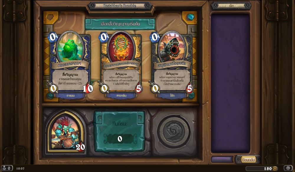 เมื่อคุณเริ่มเล่นศึกตะลุมบอน คุณจะต้องเลือกทีมที่คุณจะเข้าร่วมโดยเลือกสื่อวิญญาณหนึ่งแบบจากที่สุ่มมาให้เลือกสามแบบ โดยแต่ละแบบจะเป็นตัวแทนของโลอาประจำทีมใน Rastakhan's Rumble ทีมแต่ละทีมจะมีสื่อวิญญาณสามแบบ รวมแล้วมีสื่อวิญญาณที่คุณจะได้พบทั้งหมด 27 แบบ! เมื่อคุณเลือกสื่อวิญญาณแล้ว คุณจะได้รับเด็คเริ่มต้นที่ประกอบไปด้วยการ์ด 10 ใบที่สนับสนุนสื่อวิญญาณนั้นๆ
