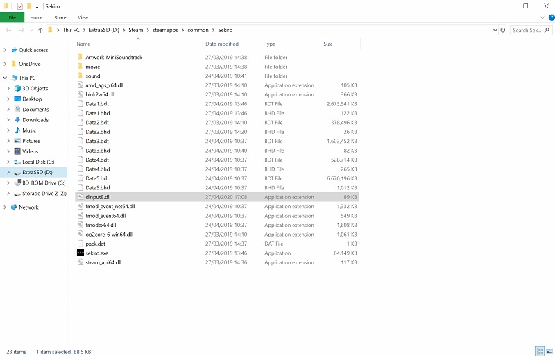 • นำไฟล์ดังกล่าว (ตามรูปด้านล่าง) ไปใส่ไว้ในโฟลเดอร์ของเกม "...\steamapps\common\Sekiro" หรือโฟลเดอร์ที่มี "sekiro.exe" แล้วกดเปิดเกมใหม่เพื่อเล่นได้ทันที
