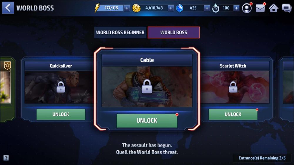 สองยูนิฟอร์มใหม่จากบีสต์และไซคลอปส์สุดเท่โดยในการอัพเดทครั้งนี้มีการปรับปรุงคอนเทนต์ในส่วนของ World Boss ซึ่งเพิ่มธีมเนื้อหา Age of Apocalypse เข้าไป ซึ่งผู้เล่นจะสามารถพบกับบอส Quicksilver, Scarlet Witch และ Cable ได้จากโหมด World Boss เนื้อหาใหม่นี้ และยังมีระบบ World Boss Beginer สำหรับผู้เล่นมือใหม่ที่จะยกเลิกข้อจำกัดแบบรายวันจากแบบเก่าให้ผู้เล่นมือใหม่ได้สัมผัสและเข้าถึงง่ายยิ่งขึ้น รวมไปถึงการปรับปรุง World Boss Ultimate ที่ถึงแม้ผู้เล่นจะแพ้แต่ก็ยังได้รับรางวัลปลอบใจอยู่ทีนี้เรามาทำความรู้จักกับ 3 ตัวละครใหม่ที่ถูกอัพเดทเข้ามาในรอบนี้กันดีกว่า และยังมีตัวละครใหม่อีก 1 ตัวที่กำลังจะเข้ามาในการอัพเดทย่อยครั้งหน้าด้วยนั่นคือ มิวแทนต์คนแรกที่อยู่เหนือเหล่ามิวแทนต์ทั้งปวง Apocalypse นั่นเอง!