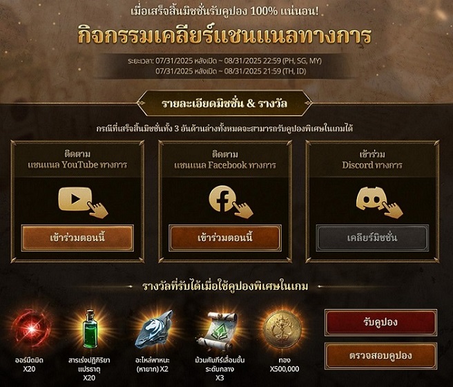 - แคมเปญ Official Channel Clear: รับคูปองของรางวัลเมื่อทำภารกิจบน YouTube, Facebook และ Discord ครบ