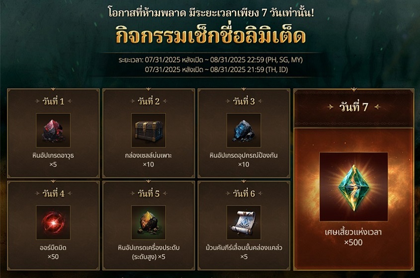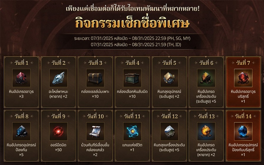 - กิจกรรมเช็กอิน: ล็อกอินครบ 7 และ 14 วัน รับไอเทมสนับสนุนความก้าวหน้า เช่น Temporal Pieces และชิ้นส่วนสัตว์ขี่