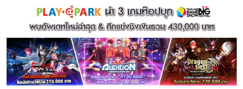 อย่าง Audition, Dragon Nest และ RAN Online อีกด้วย ไม่ว่าจะเป็นการแข่งขันชิงเงินรางวัลรวมกว่า 430,000 บาท, Show พิเศษจาก 2 เกมดัง Audition Dance Party EP.11 เก่ง ธชย , Dragon Nest & FEDFE Boy Band โชว์ฝีมือแบทเทิ้ลกับแชมป์ และ Login รับไอเทมสุดแรร์ ทั้ง 3 เกม & ทดลองเล่นทดสอบแพทช์ใหม่ก่อนใคร รับพรีเมี่ยม จาก PLAYPARKไปเลย!! พบกันได้ที่งาน ตั้งแต่วันที่ 3 - 4 - 5 พฤศจิกายนนี้ ที่งาน TGSBIG2017 รอยัล พารากอน ฮอลล์
