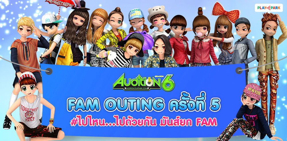 AUDITION เกมแดนซ์ออนไลน์จาก PLAYPARK ขอชวนขาแดนซ์ออดิชั่นร่วมกิจกรรม FAM Outing ครั้งที่ 5 #ไปไหนไปด้วยกัน #มันส์ยกFAM ลุ้นเป็น 6 แฟมผู้โชคดีที่ได้ไปร่วมกิจกรรมที่มูลนิธิสถาบันแสงสว่าง และ ไปสนุกกันต่อที่สวนสยาม ทะเลกรุงเทพ  แถมผู้ร่วมกิจกรรมยังได้ลุ้นไอเทมอีกเพียบ!!  เพื่อนๆ ทุกคนสามารถร่วมกิจกรรมได้ตั้งแต่วันนี้– 16 พฤศจิกายนนี้ และจะประกาศผลผู้โชคดี วันที่ 19 พฤศจิกายนนี้ ห้ามพลาดเด็ดขาดนะจ้ะรายละเอียดกิจกรรมเพิ่มเติม (คลิกที่นี่)