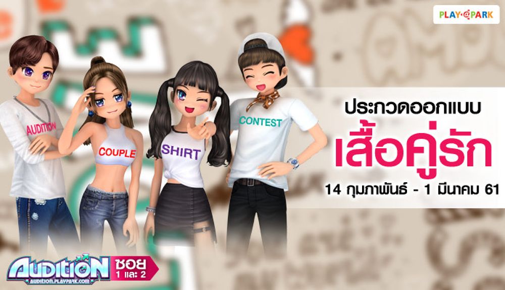Audition เกมแดนซ์ออนไลน์จาก PLAYPARK.COM ชวนเพื่อนๆ ขาแดนซ์ ที่มีใจรักและความสามารถในการออกแบบมาโชว์ของ กับกิจกรรมประกวดออกแบบเสื้อคู่สุดหวานแห่งปี Audition Couple Shirt Contest ชิงเงินรางวัลรวมกว่า 10,000 บาท โดยทุกคนที่ส่งผลงานยังได้รับแรร์ไอเทมของถือ “Stellar Pink Cotton Candy” สุดแบ๊ว ไปใส่ฟรีๆด้วย