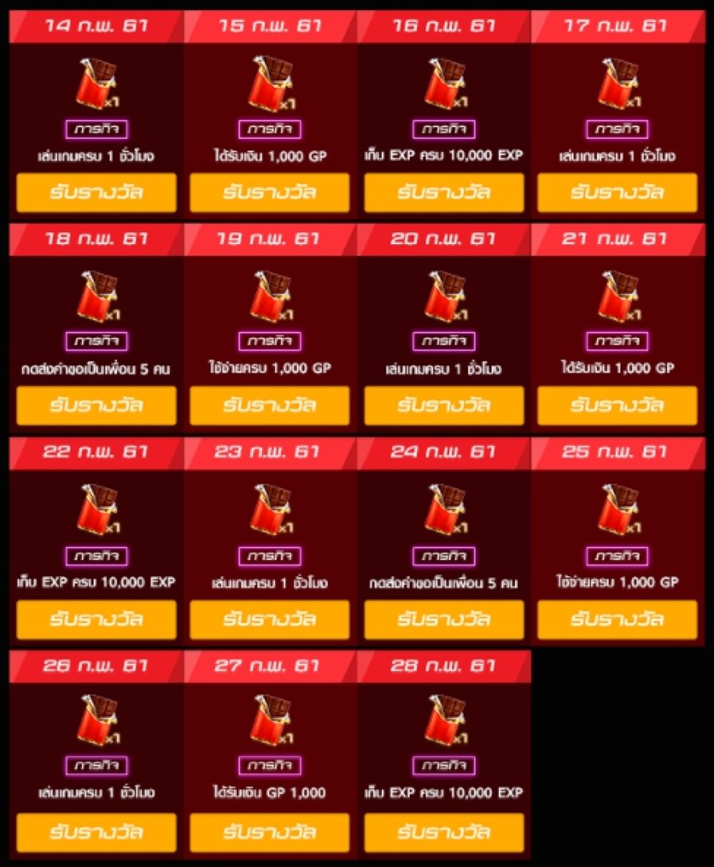 ได้ปล่อยภารกิจต้อนรับสิ่งดีๆจากเดือนแห่งความรักนี้เพียงทำการล็อคอินเข้าเล่นเกมตามระยเวลาที่กำหนด เพียงเท่านี้ก็มีสิทธิ์รับแรร์ไอเท็มกันไปแบบฟรีๆ สามารถร่วมสนุกกันได้ตั้งแต่วันนี้ถึง 28 กุมภาพันธ์นี้เท่านั้น