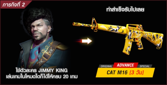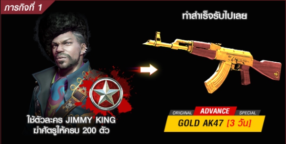 •ภารกิจที่ 1 ผู้เล่นต้องใช้ตัวละคร Jimmy King ทำการฆ่าศัตรูให้ครบ 200 ตัว ทำสำเร็จรับปืน Gold AK47(3วัน)