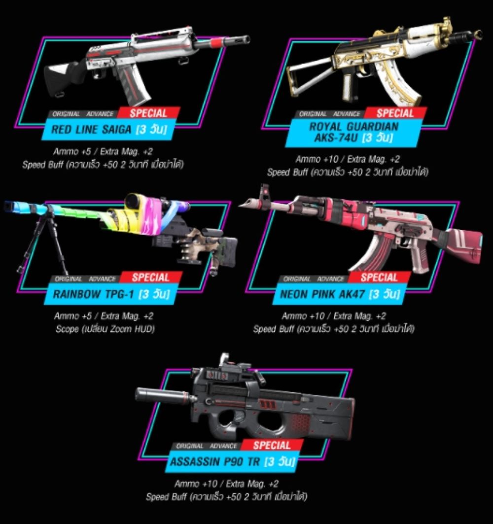 •ของรางวัลสำหรับผู้ร่วมสนุกกิจกรรมมีสิทธิ์รับปืน Red Line Saiga[3วัน], Royal Guardian AKS-74U [3วัน], Rainbow TPG-1 [3วัน], Neon Pink AK47 [3วัน], Assasin P90 TR [3วัน]