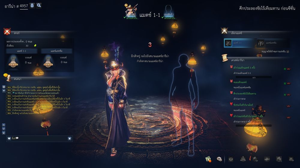 หลังจากรับเควสจากป้ายด้านบนแล้ว ให้เรากด F8 จะพบกับหัวข้อให้เลือกอยู่สามหัวข้อ ให้เลือกไปที่ "แมตช์อารีน่า" ดังภาพ เมื่อกดเสร็จ ตัวเราจะวาร์ปเข้าสู่ Lobby ห้องรอทันที ในห้องรอนั้นประกอบด้วยโหมดสองโหมดคือ "แมตช์ 1-1" ที่จะเป็นการดวลกันแบบหนึ่งต่อหนึ่ง และ "แมตช์แทคทีม" ที่จะใช้ผู้เล่นทีมละ 3 คน ผลัดกันเข้า ๆ ออก ๆ คล้าย ๆ กีฬามวยปล้ำ ซึ่งทั้งสองโหมดจะไม่ใช้แต้ม Rank รวมกัน