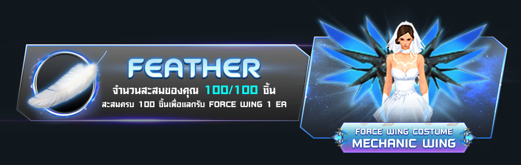 พิเศษ! เมื่อสะสมไอเทมขนนก Feather ครบจำนวน 100 ea แลกรับทันที Force Wing Costume : Mechanic Wing (แลกเปลี่ยนได้)