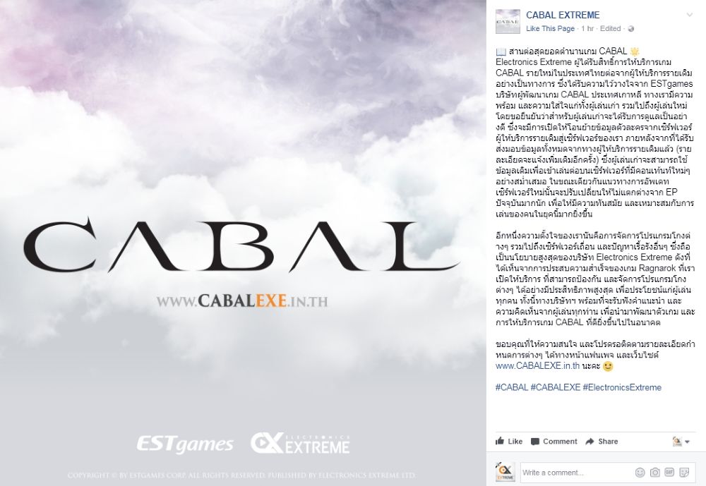 ได้รับสิทธิ์จากบริษัท EST Games ให้เป็นผู้ให้บริการเกม Cabal ในประเทศไทย