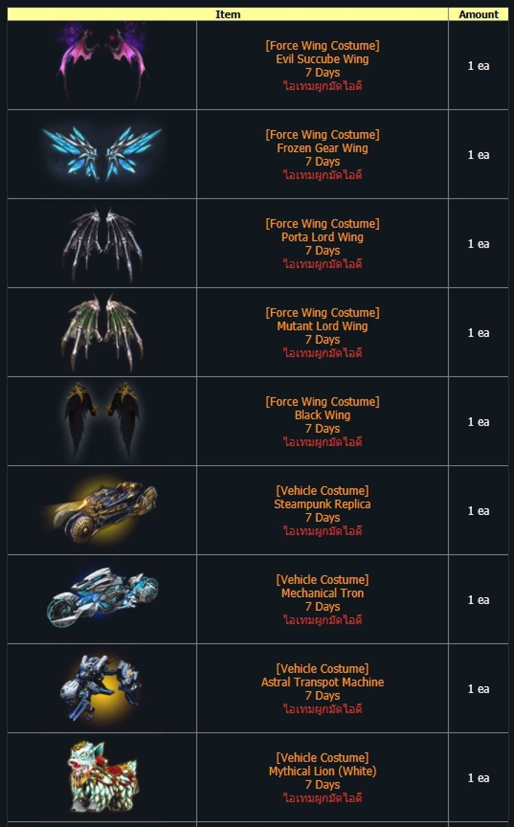 Evil Succube Wing 7 วัน, Frozen Gear Wing 7 วัน, Porta Lord Wing 7 วัน,Steampunk Replica 7 วัน, Mechanical Tron 7 วัน